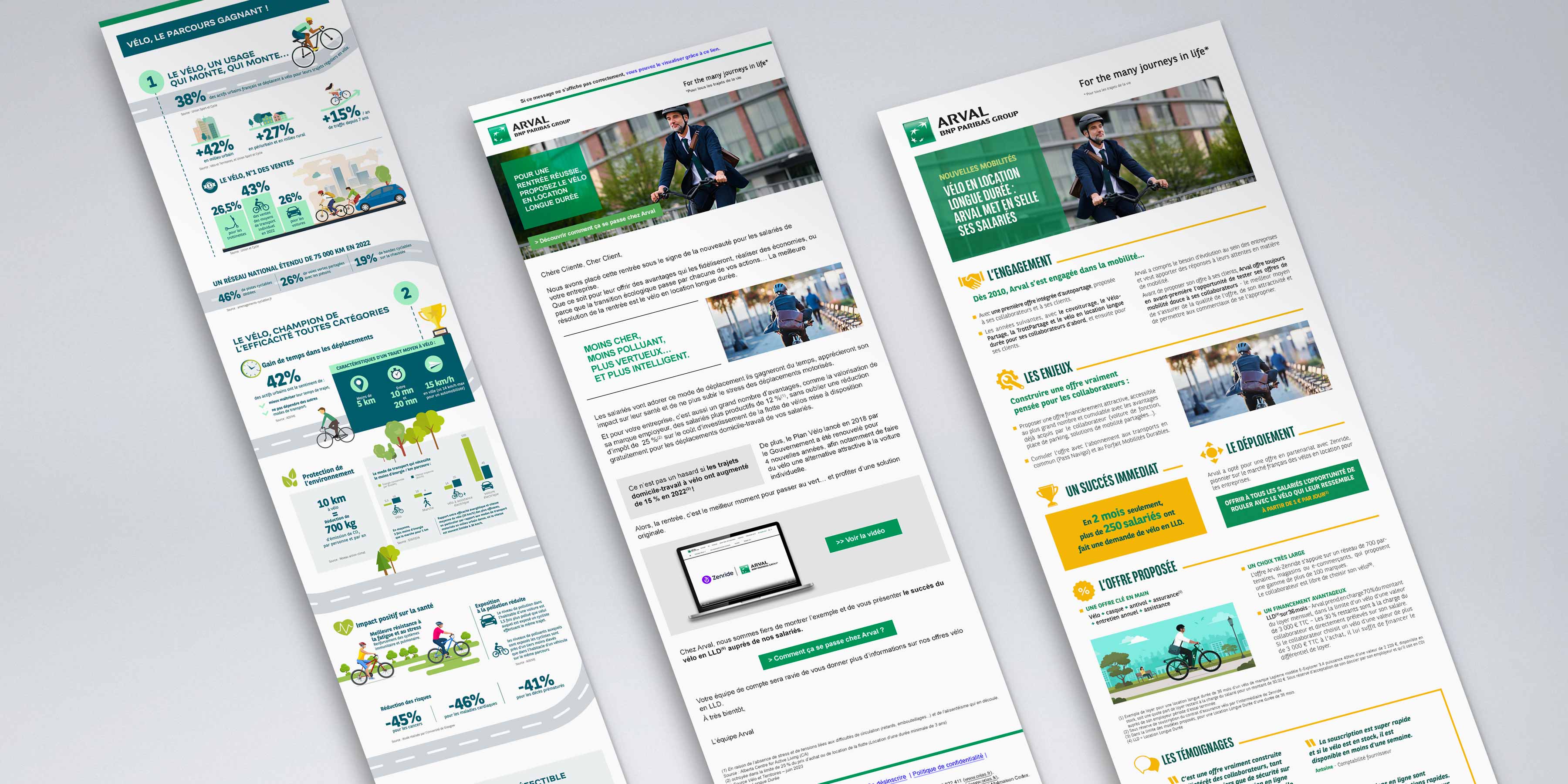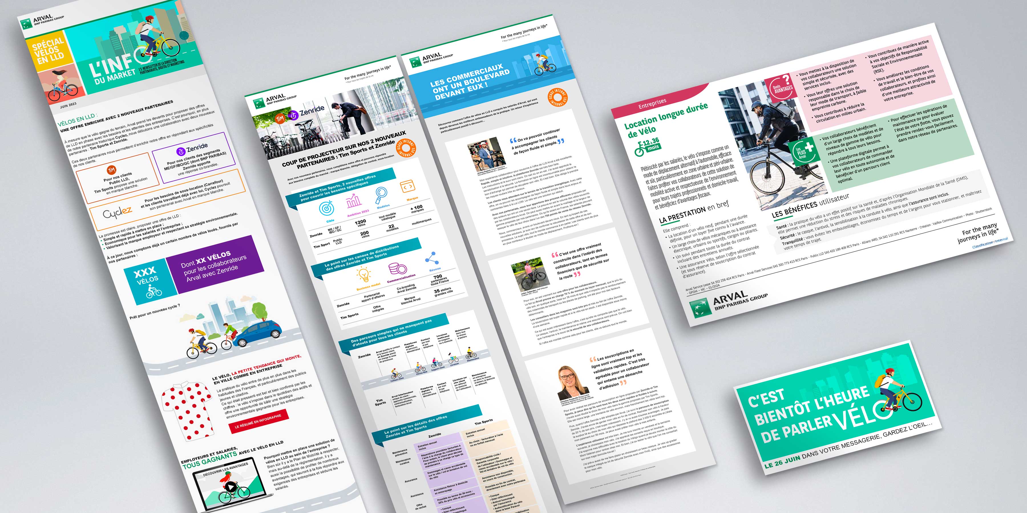 Pour le lancement de son service de Location Longue Durée de vélos, Arval a pu compter sur un déploiement tout terrain auprès de ses clients entreprises, gestionnaires de flotte et salariés, et de son réseau. Utiliser tous les canaux pour construire une prise de parole qui porte et fait la part belle à l’expérience, accompagner du lancement à la mise en place : une campagne intégrale, alliant fun et pédagogie pour promouvoir le deux-roues en entreprise.